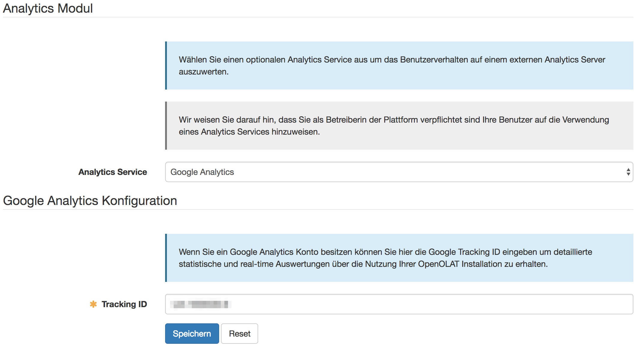 Initial wird Google Analytics unterstützt. Die Aktivierung erfolgt in der Administration unter "Externe Werkzeuge". Um Google Analytics in OpenOlat zu nutzen, ist zwingend ein Google Analytics Account notwendig. Zudem muss eine sogenannte Tracking-ID hinterlegt werden.