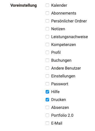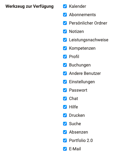 Hier können Administratoren einstellen, welche OpenOlat Werkzeuge den Usern standardmässig zur Verfügung gestellt werden, z.B. Kalender, persönliche Ordner, E-Portfolio, Chat usw. sowie welche Werkzeuge in der Menüleiste für den Schnellzugriff aktiviert sind (Voreinstellung).