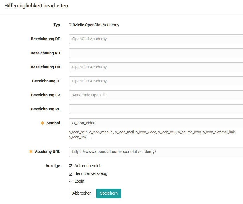 Hier kann definiert werden welche Hilfeseiten über das Hilfe-Icon im allgemeinen Menü bereitgestellt werden. Auch ein Link zum Support Kontaktformular ist möglich.