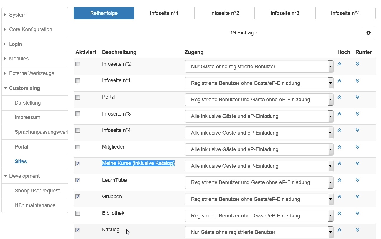 Wenn Gäste Zugriff auf Kurse erhalten sollen, muss entweder der "Katalog" oder "Meine Kurse (inklusive Katalog)" für die Gäste aktiviert sein.
