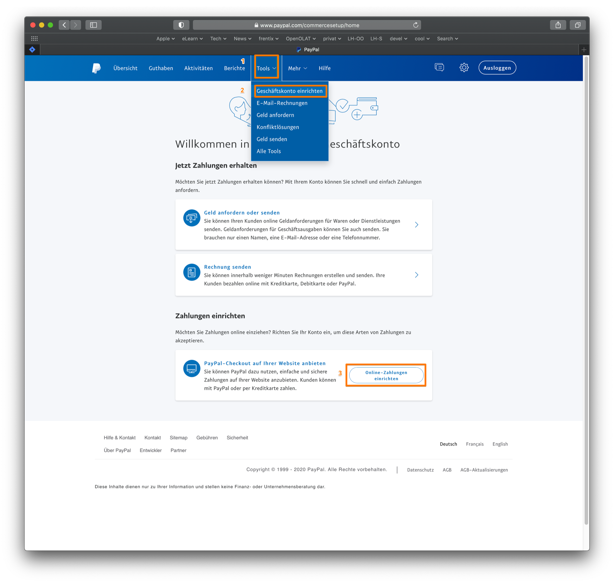 Schritt 1: klicken Sie auf den Tab "Tools" (1) und wählen Sie den Punkt "Geschäftskonto einrichten" (2) aus. Klicken Sie auf den Button "Online Zahlungen einrichten" (3).