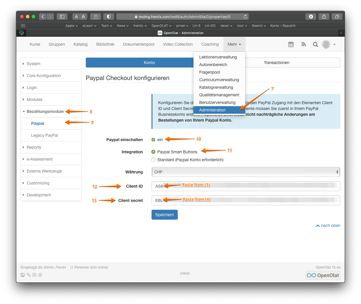 Klicken Sie auf den Tab "Administration" (7). Klicken Sie links in der Navigation auf "Bezahlungsmethode" (8) und dann auf "PayPal" (9).