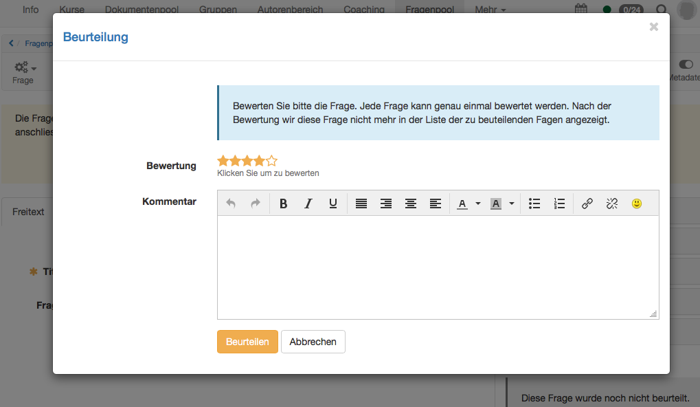 Hier können Sie nun zum einen die Bewertung mit den Sternen vornehmen und zum anderen einen Kommentar hinzufügen. vor allem wenn die Bewertung unter dem Grenzwert liegt ist ein Kommentar zentral. Nur so hat der Ersteller der Frage die Möglichkeit, die Frage anhand Ihrer Rückmeldung zu verbessern. Mit "Beurteilen" wird Ihre Beurteilung gespeichert.