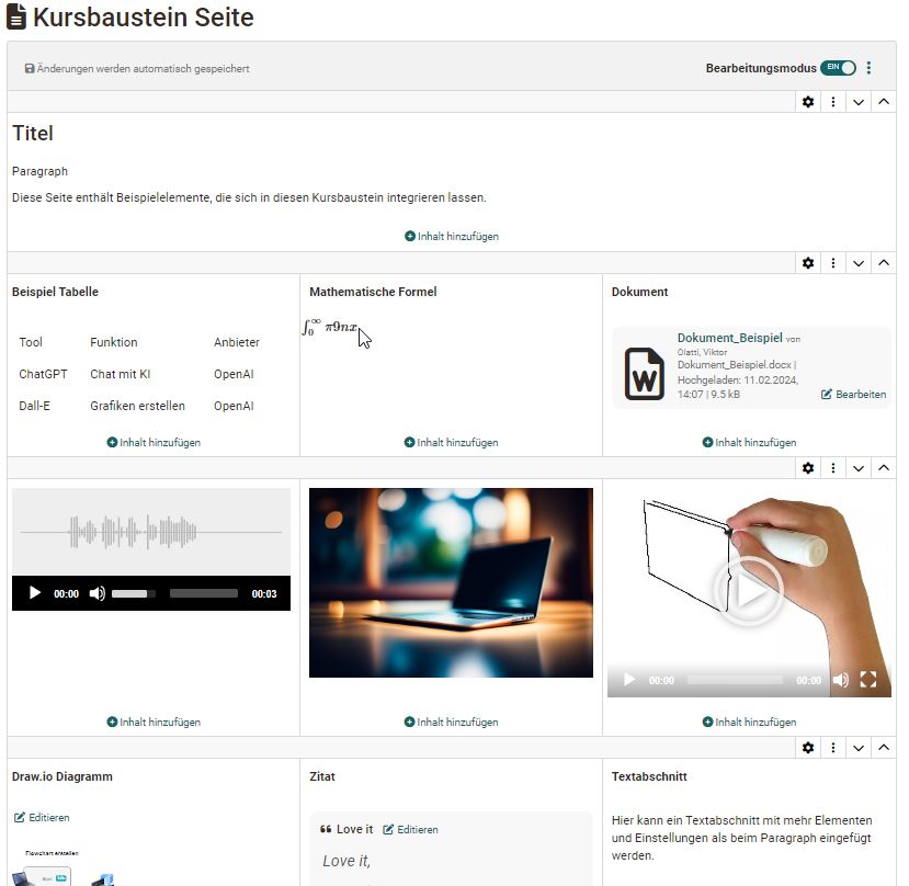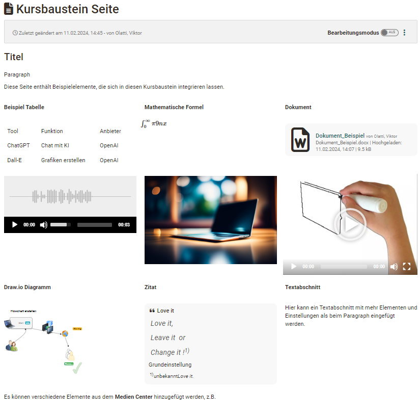 | Spezialität / Hinweis | Die Bearbeitung in einem blockbasierten Editor wird neben dem Kursbaustein Seite auch in Formular-Lernressourcen und Portfolio-Einträgen verwendet. |