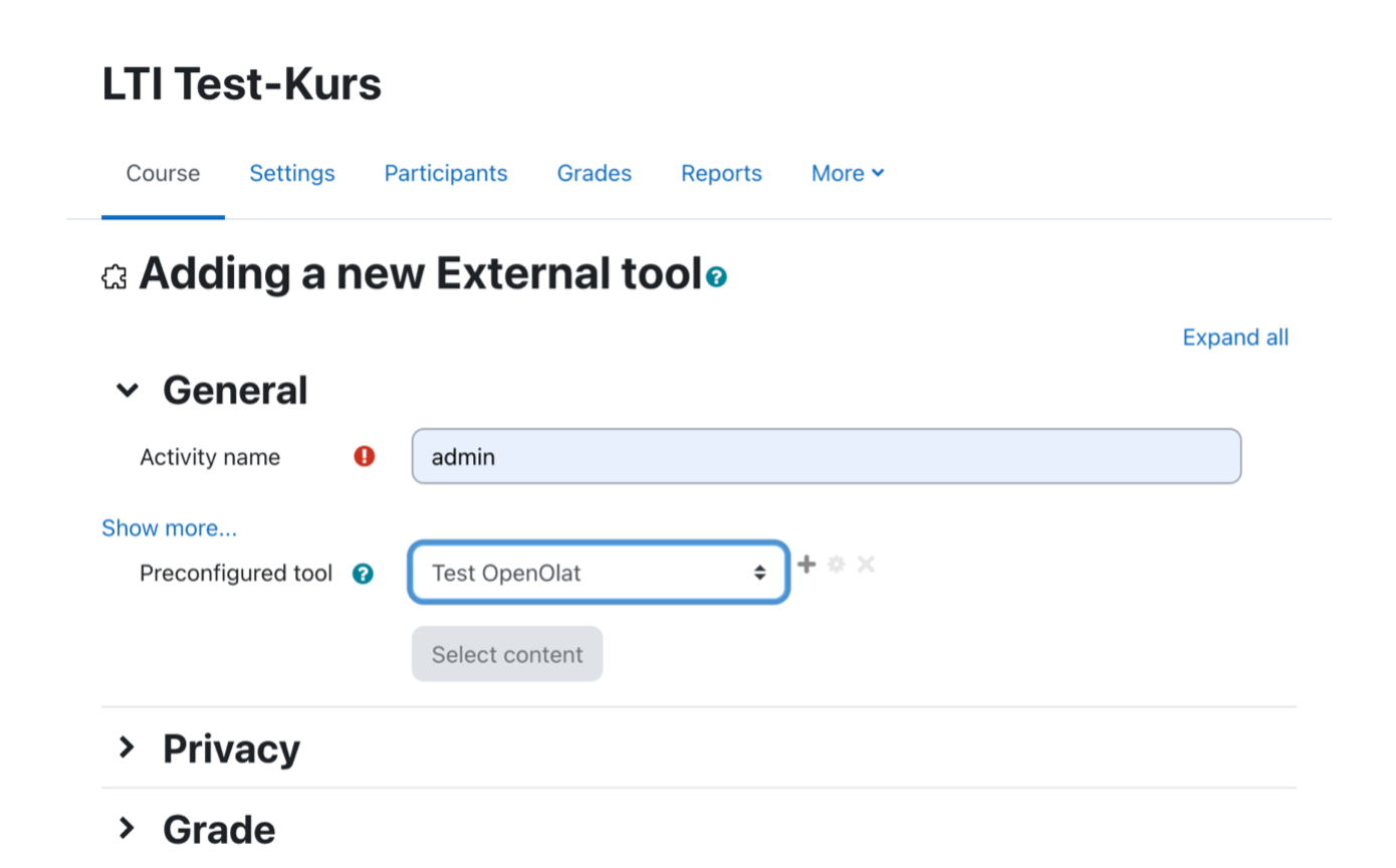 Der konfigurierte OpenOlat-Kurs lässt sich hier im externen Tool auf Moodle als "preconfigured tool" auswählen.