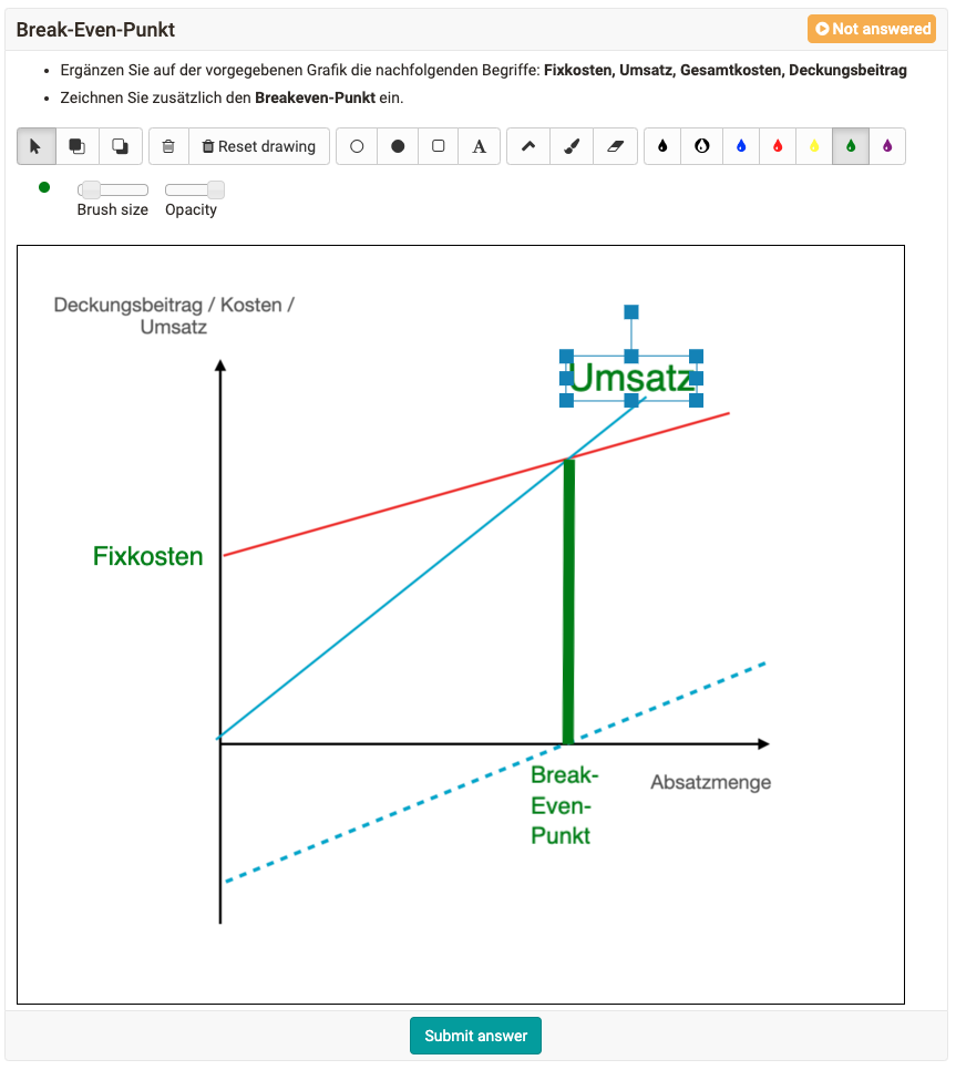 Der Fragetyp "Zeichnen" wurde komplett neu umgesetzt und um ein Textwerkzeug ergänzt. Eingefügte Texte können in Farbe und Grösse angepasst, gedreht sowie neu positioniert werden. Somit ist auch eine Beschriftung von Grafiken einfacher möglich.