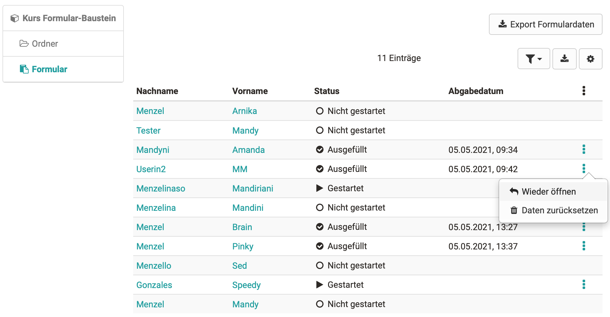 Betreuende sehen in der Übersichtstabelle den Bearbeitungsstatus der Teilnehmenden. Bereits abgegebene Formulare können zur weiteren Bearbeitung durch den Teilnehmenden vom Betreuer wieder geöffnet oder auch komplett zurückgesetzt werden. Mit Klick auf die Teilnehmenden kann das ausgefüllte Formular angesehen werden. Die Formulardaten aller Teilnehmenden stehen als Excel-Export zur Verfügung.