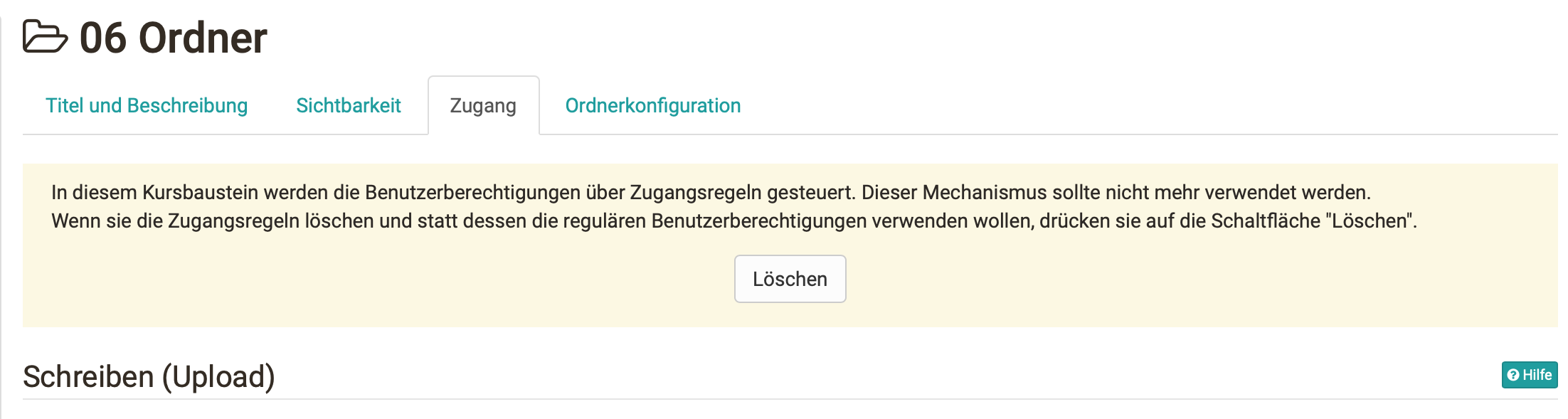 Mit OpenOlat 15.0 wurden die Einstellungen der Benutzerrechte in Kursbausteinen (z.B. "Hochladen" im Kursbaustein "Ordner") aus dem Tab "Zugriff" in das Tab "Konfiguration" verlagert. Dieses rollenbasierte Konzept ist für einige Szenarien nicht ausreichend.