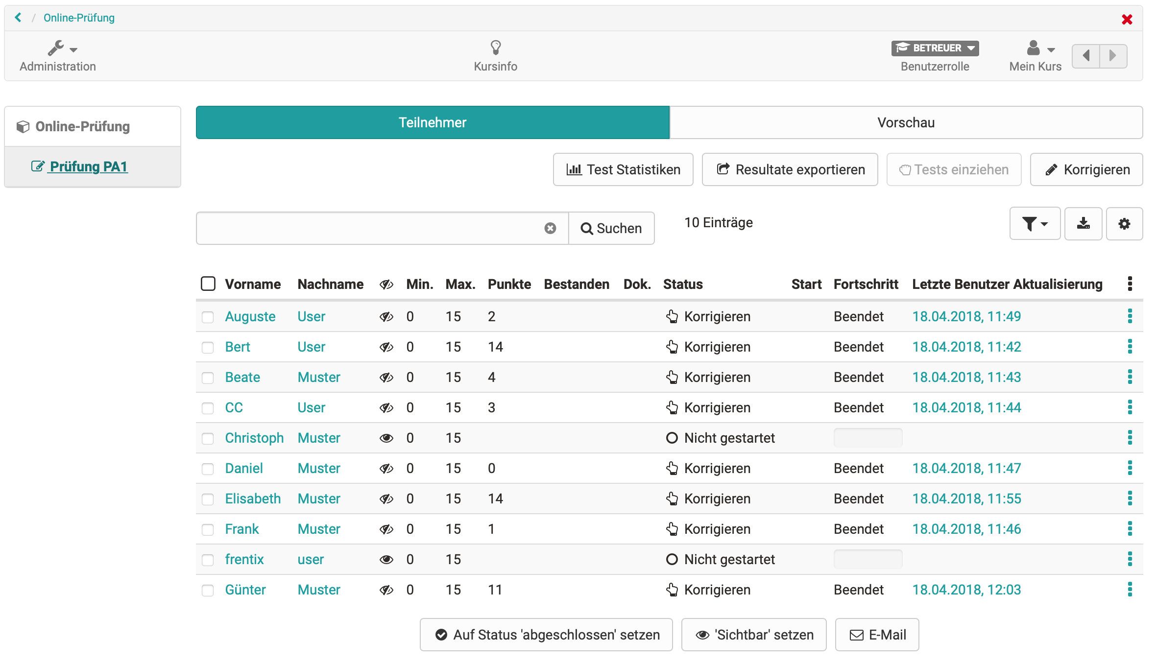 Betreuende sehen nun in einem separaten Tab die, aus dem Bewertungswerkzeug bekannte, Tabelle der Teilnehmenden und können wie gewohnt die Korrektur vornehmen oder Daten exportieren. Auch der Prüfungsmodus kann in dieser Ansicht gestartet bzw. beendet werden.