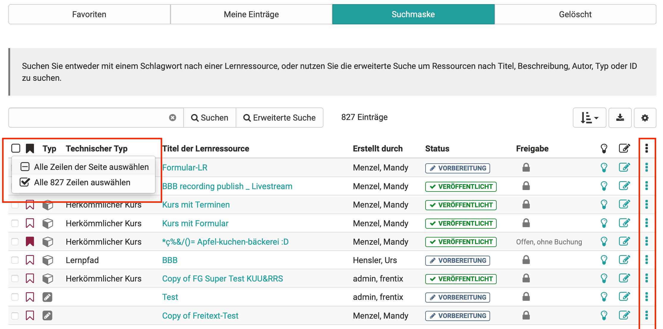 Ein Refactoring wurde für die Auswahl von Zeilen in Tabellen durchgeführt. So können nun alle Einträge der Seite oder der gesamten Tabelle über die Checkbox oben links selektiert werden.