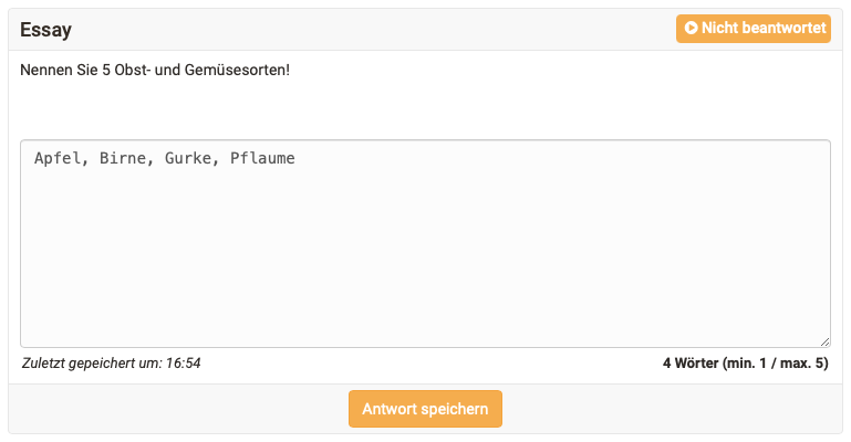 Als Hilfestellung für Teilnehmende wird bei Freitext-Fragen unterhalb des Textfeldes die aktuelle Wortanzahl des bereits geschriebenen Textes angezeigt. Falls vorhanden, folgt dahinter die konfigurierte minimale bzw. maximale Wortanzahl.