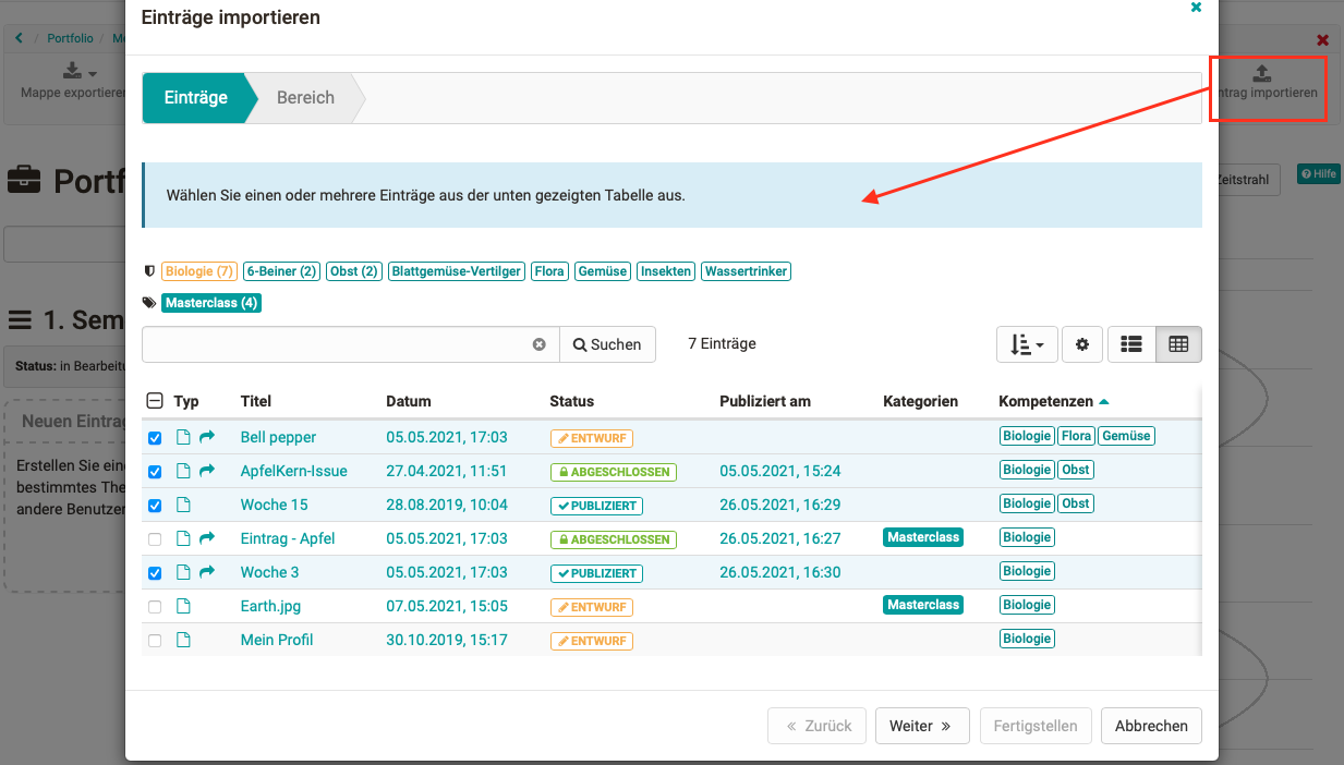 Bestehende Einträge können in andere Mappen importiert werden oder eine neue Portfolio-Mappe wird direkt aus vorhandenen Einträgen erstellt. Referenzierte Einträge werden als solche gekennzeichnet. Bei Änderung eines referenzierten Eintrags in einer Mappe wird dieser auch in allen anderen Mappen aktualisiert.
