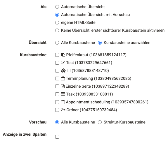 On the top course note and all structure course elements, further settings for the display can be made in the tab "Overview". One advantage is the use of the automatic overview, especially as an orientation aid for the user. Here you can select all or specific course elements for the automatic overview.