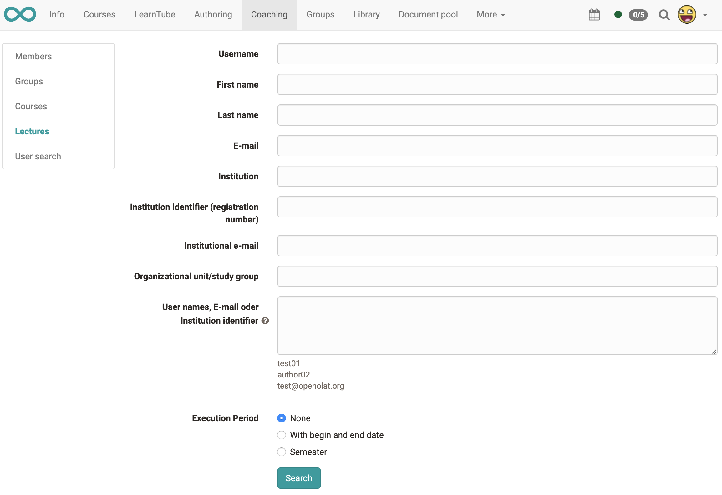 The Coaching Tool can be used to obtain an overview of absences over several courses or over an entire semester. In the menu on the left "Lectures" is selected. Now you can search for a user, for example. All courses with absence management by this user will then be displayed.