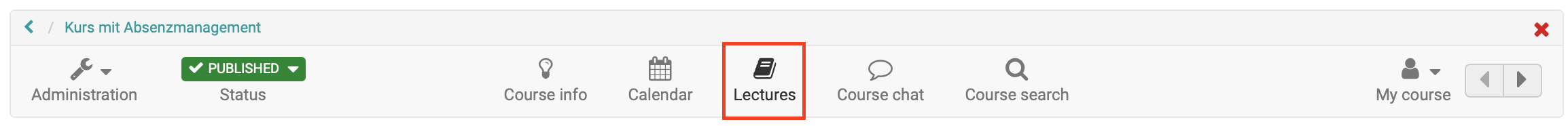 Lecturers can open the absence check in the toolbar of the corresponding course.