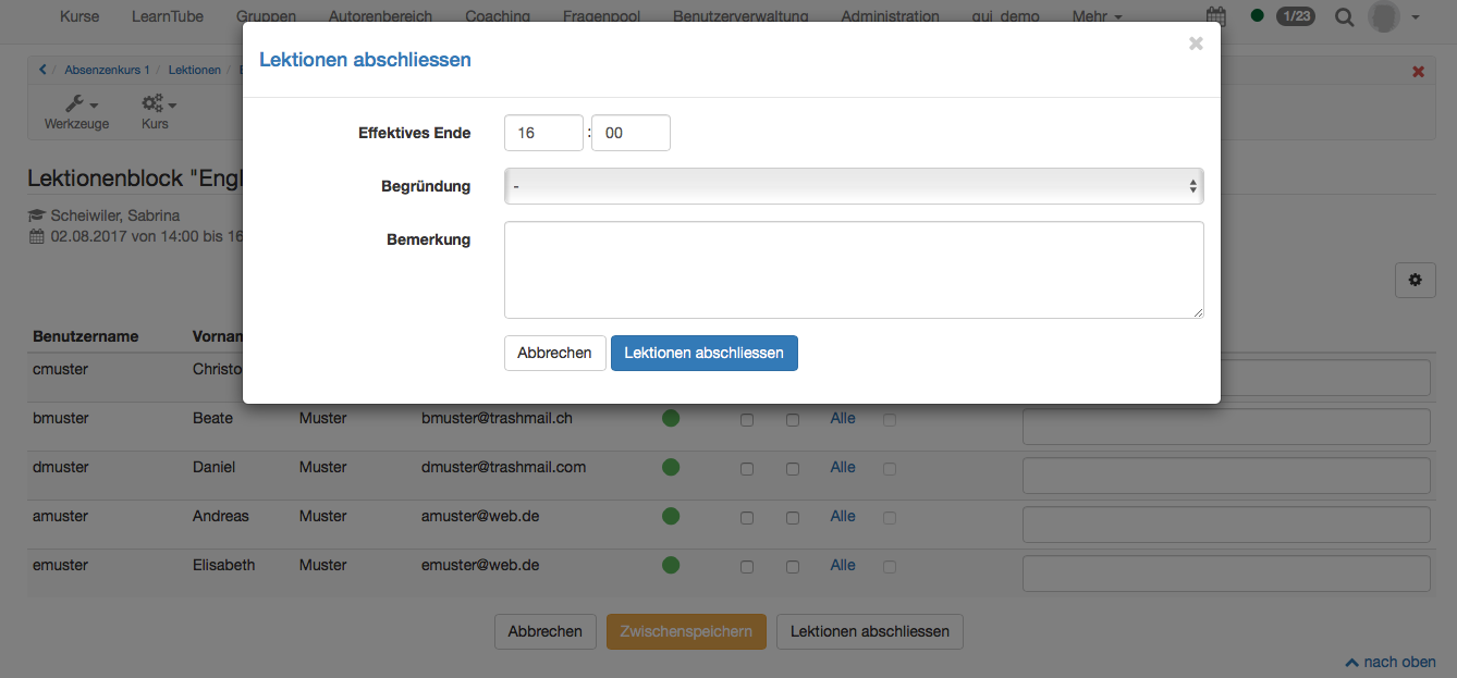 As soon as the absence check is completed, you can "complete the lecture". The "Effective end" must be entered here. The planned end is displayed by default. The evaluation gives course owners an overview of whether the lecture blocks were completed as planned or why they were completed at a different time. This is because a reason must also be selected here. For example, the earlier termination of the lecture block can be justified by working through pauses. If desired, a comment can be added to the entire lecture block. This remark is only visible for the course owner.