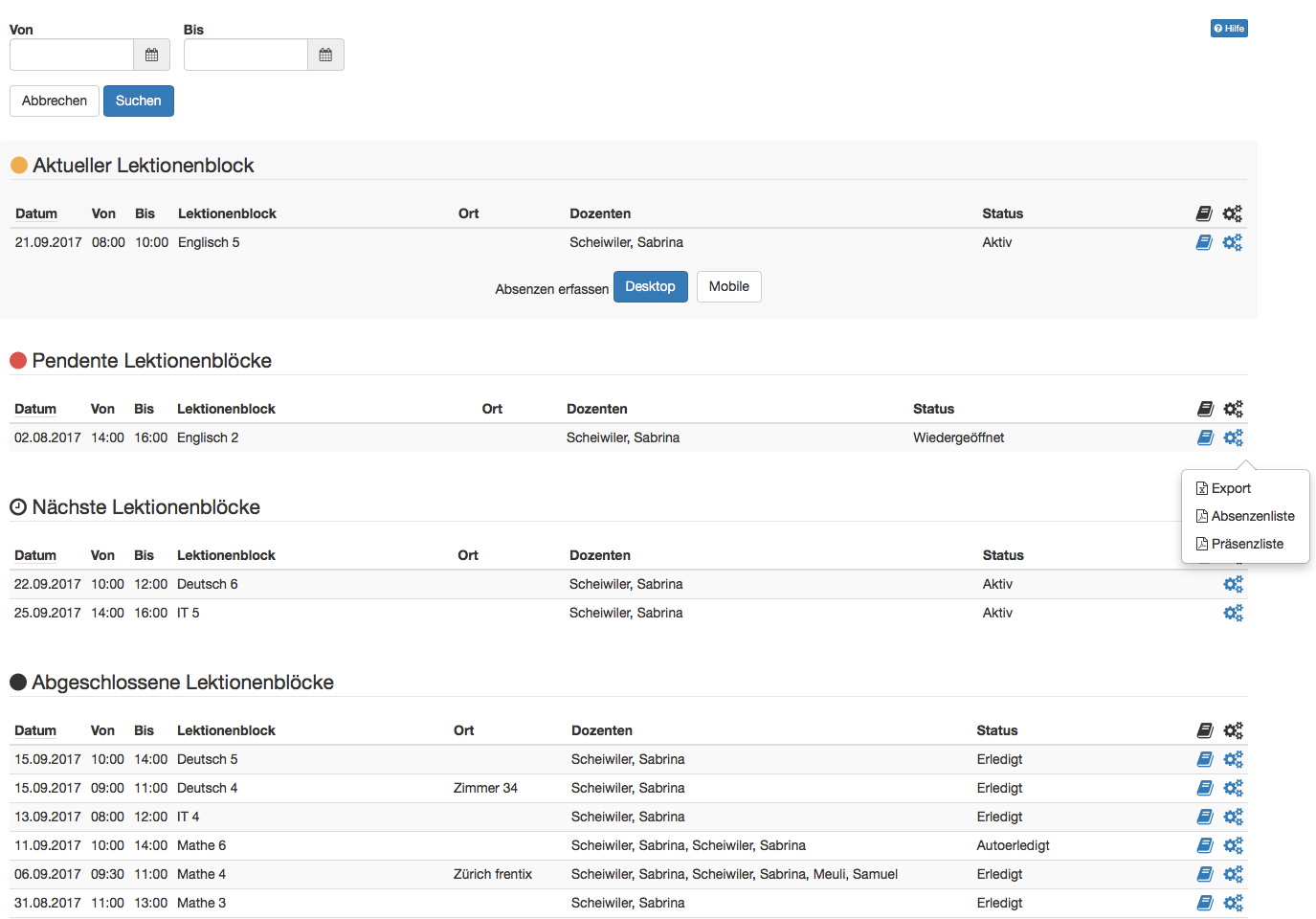 Current lecture block: The absences check can also be started from here. Again either the desktop or the mobile view can be opened.