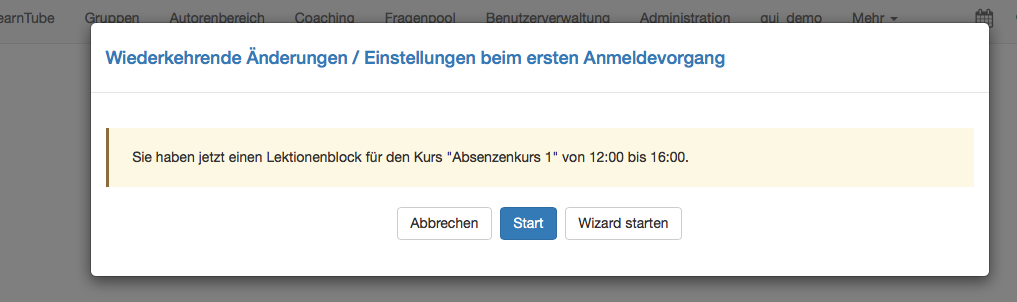 If a course has an active lecture block during login, the absence control can be opened directly. "Start" opens the absences control for the desktop view, "Start Wizard" opens the mobile view.