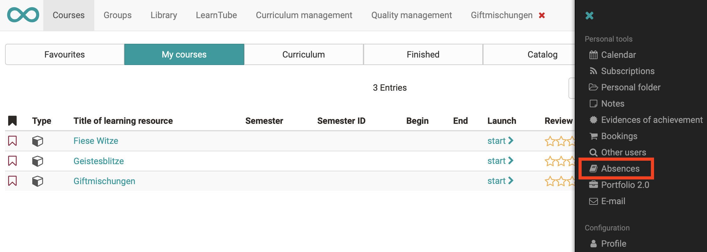 Here the user (course participant) can see the courses in which absence management is used. The overview includes the tabs daily overview, lessons and absences with all courses, the user's cancellations and absences as well as any appeals.