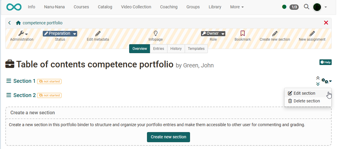 Open the portfolio template in authoring and "My entries". Select either the desired section in "Overview" or the link "New assignment" from the menu. Afterwards you can assign it to the section.