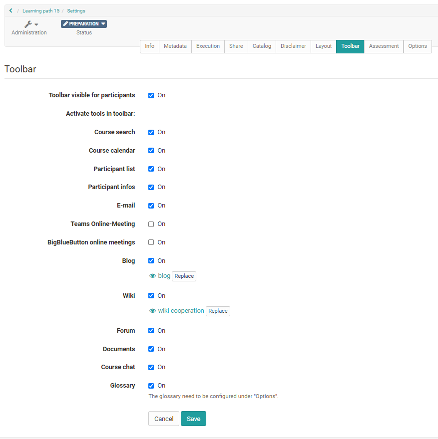 Once a glossary has been integrated into a course, the link to the glossary will appear in the course toolbar. In order to make that glossary visible in the toolbar you have to activate the corresponding tool "Glossary" in the tab "Toolbar".