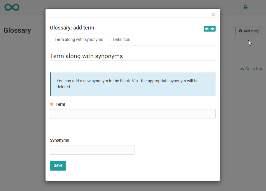 Enter the desired technical term under "Term". You can also add synonyms. For example, the term "Information Technology" can be supplemented with the synonym "IT". In the tab "Definition" you can then add the concrete definition of the term. Terms that have been entered can also be changed or deleted afterwards.
