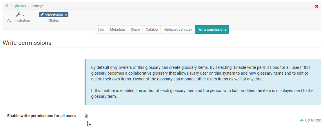 In the learning resource "Glossary" you can define in the tab "Write permission" if only owners of that learning resource are allowed to create and edit contributions or if users are granted that right as well. Owners of the learning resource "Glossary" can basically change and delete all glossary entries created. By default new glossary entries can only be made by course owners.