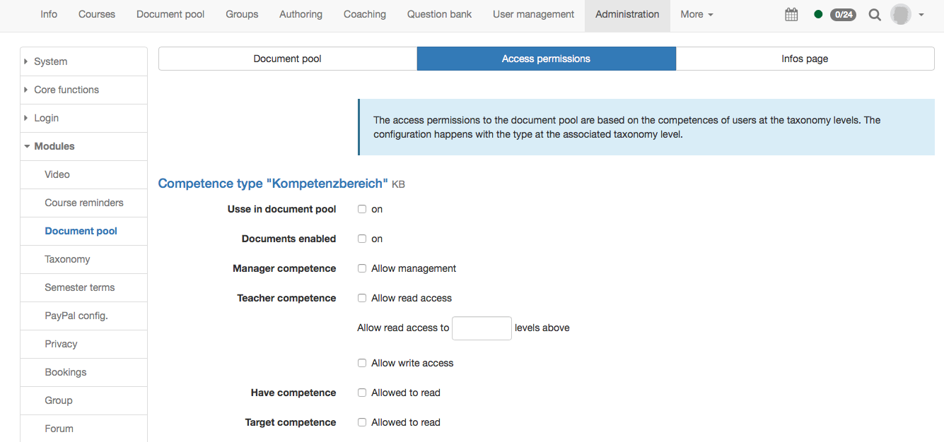 - Teacher competence: In the teacher competence the access rights of the single levels of the document pool can be defined. First it is selected if a user with teach competence has read access to this level. If yes, the users can read the content of this level. Furthermore it can be defined if the read access is also valid on the other elements of the same hierarchical level. Therefore 1 instead of 0 need to be inserted.