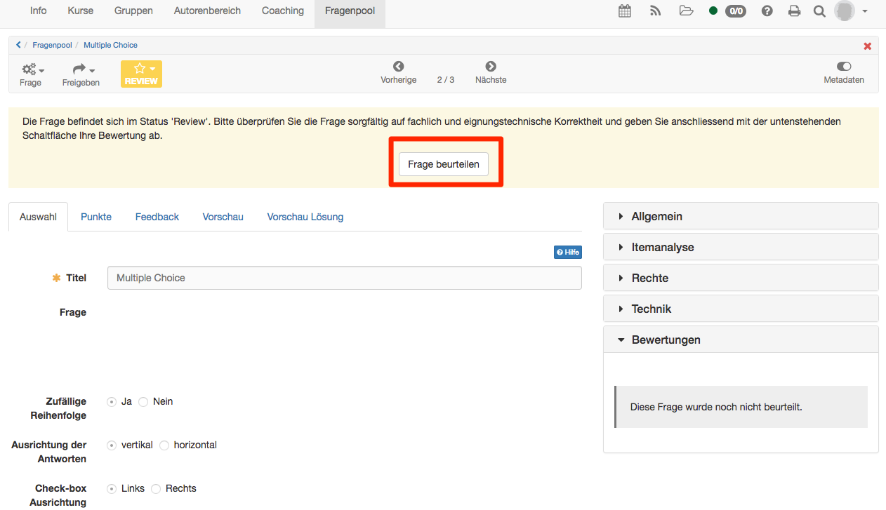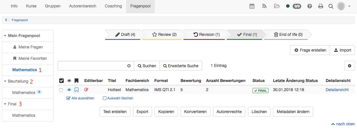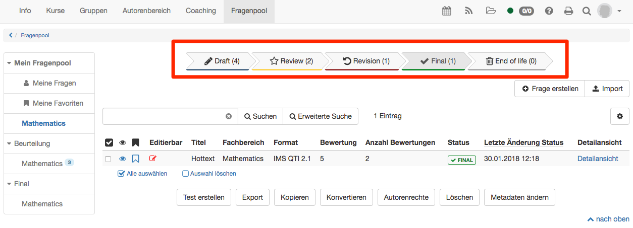 - Final: If a question fulfills the evaluation criteria, it is assigned the status Final. Here are the questions that have survived quality assurance and can be integrated into tests.