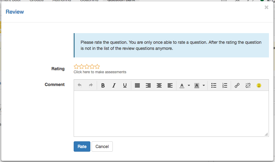 Here you can now enter the star rating and add a comment. A comment is particularly important if the rating is below the threshold value. This is the only way the question creator has the opportunity to improve the question based on your feedback. Click "Rate" to save your assessment.