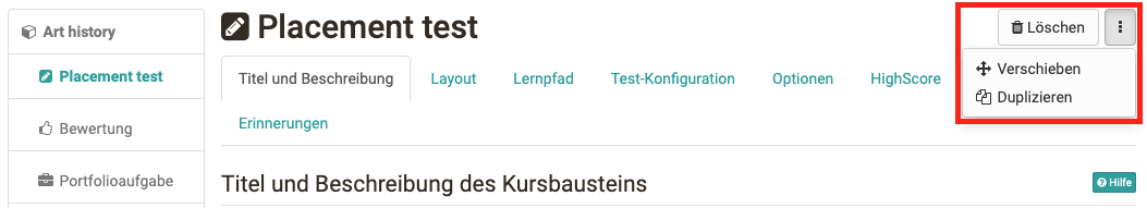 Ist ein Kursbaustein im Kurseditor ausgewählt kann er über die Schaltfläche "Löschen" oben rechts gelöscht werden. Über das 3-Punkte-Menü daneben kann der Kursbaustein auch innerhalb des Kurses verschoben oder dupliziert werden.