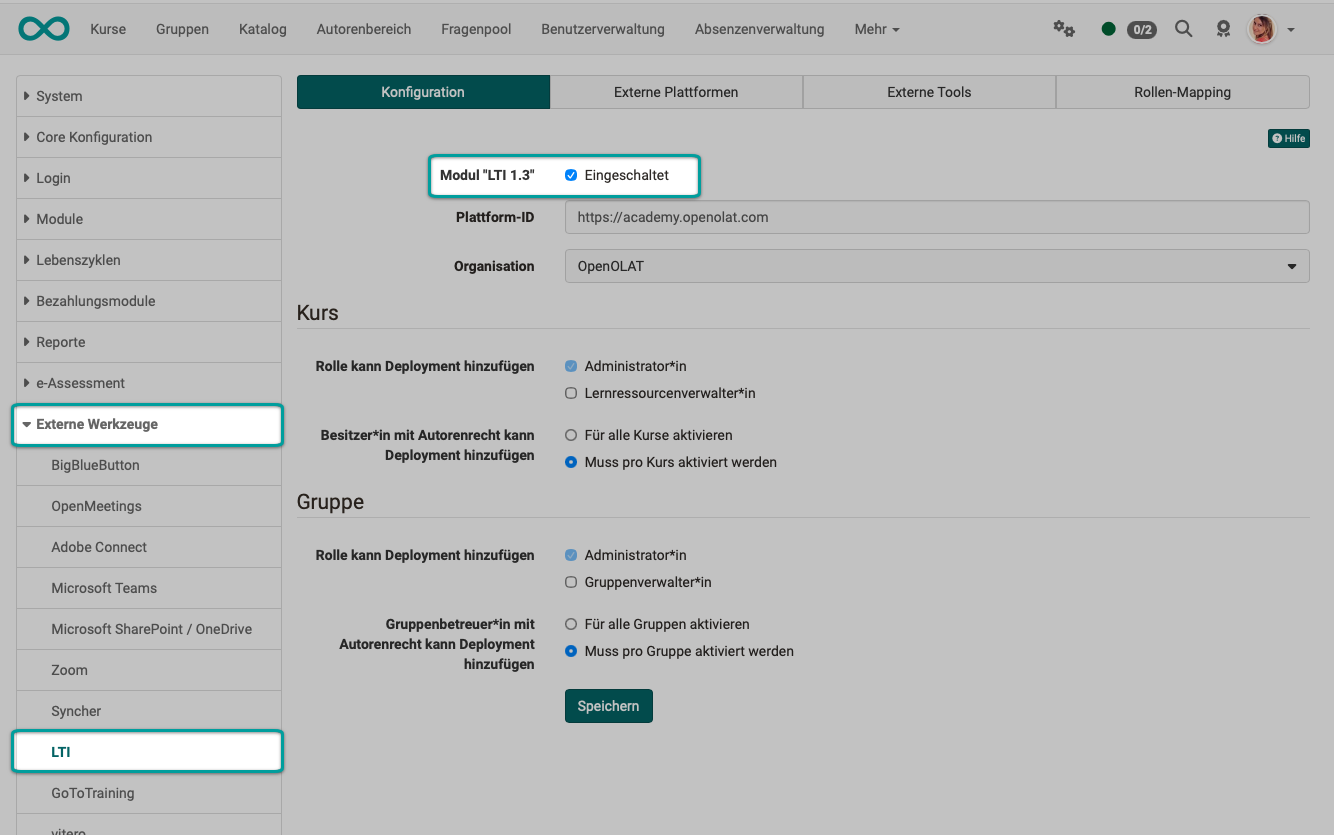 Die Administration von LTI 1.3 befindet sich in OpenOlat unter folgendem Pfad: