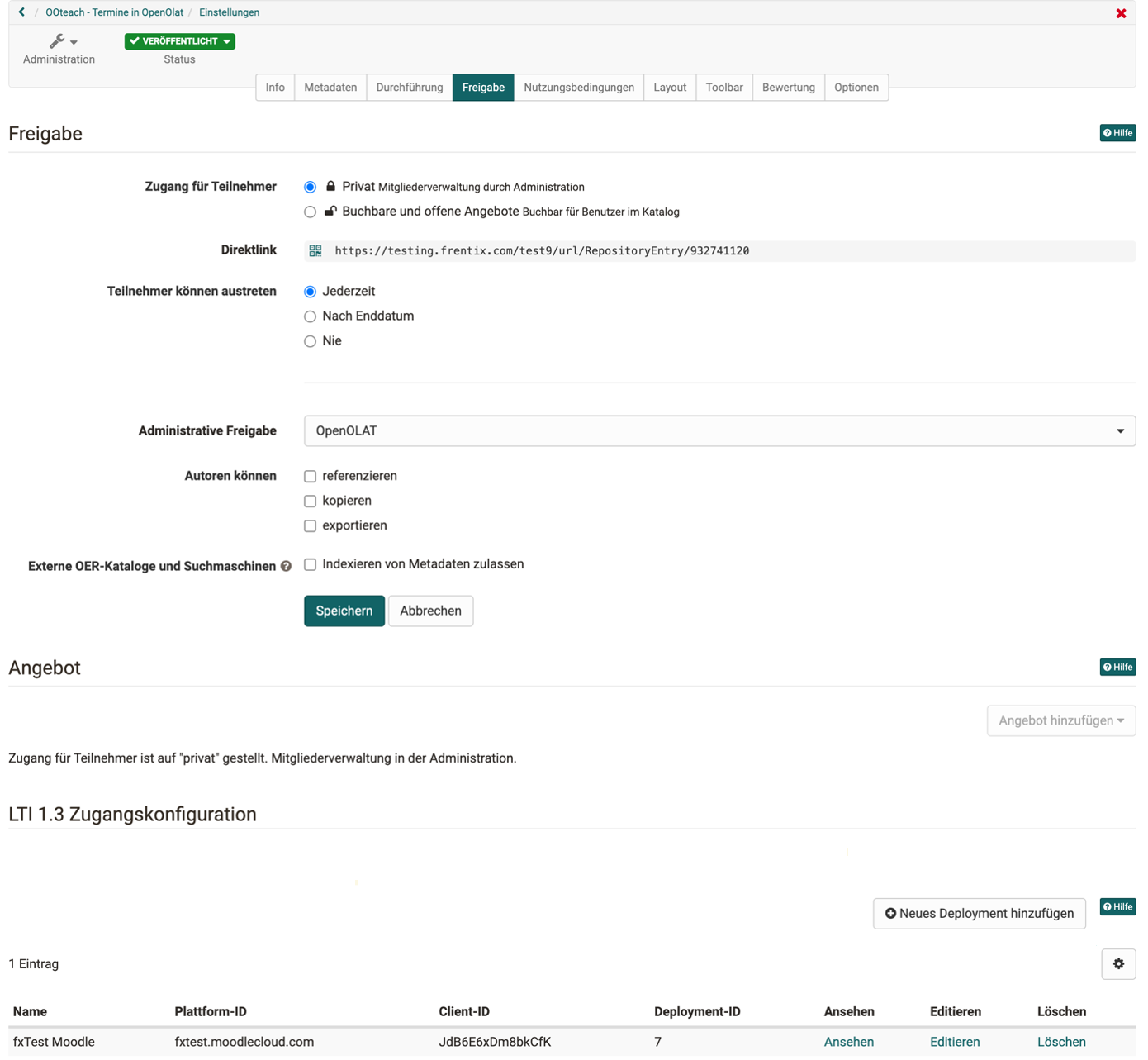 3. LTI-Freigabe des Kurses in OpenOlat