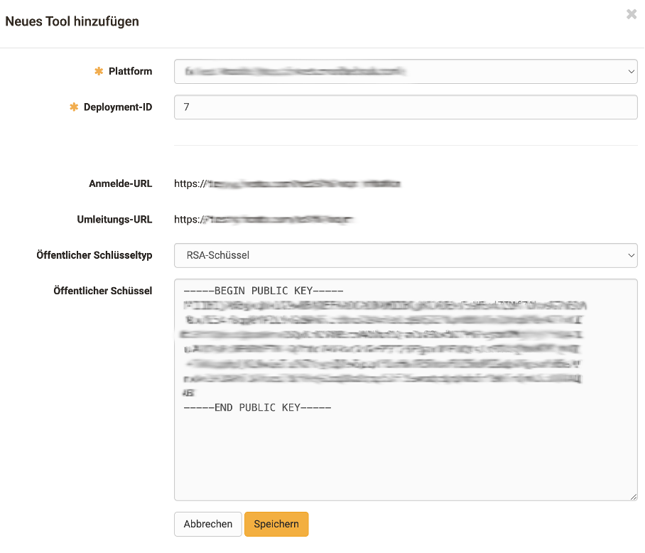 | Deployment-ID | Aus Moodle: Deployment ID aus dem Dialog "Tool configuration details" |